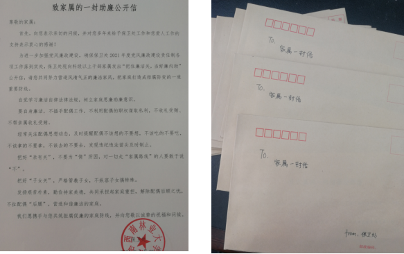 会议接近尾声,保卫处向处内科级以上党员干部家属发放“至家属的一封助廉公开信”,协同家属共同营造风清气正的廉洁家风,构筑拒腐防变重要防线。全体党员同志也纷纷到处内“清廉西林”板报墙签名承诺,今后工作中要继续遵守学校规章制度,规范自身言行举止,明确师德底线,继续深入学习贯彻习近平新时代中国特色社会主义思想,坚持做到不忘初心、牢记使命、廉洁奉公、服务师生,为实现学校高质量发展而不懈努力。