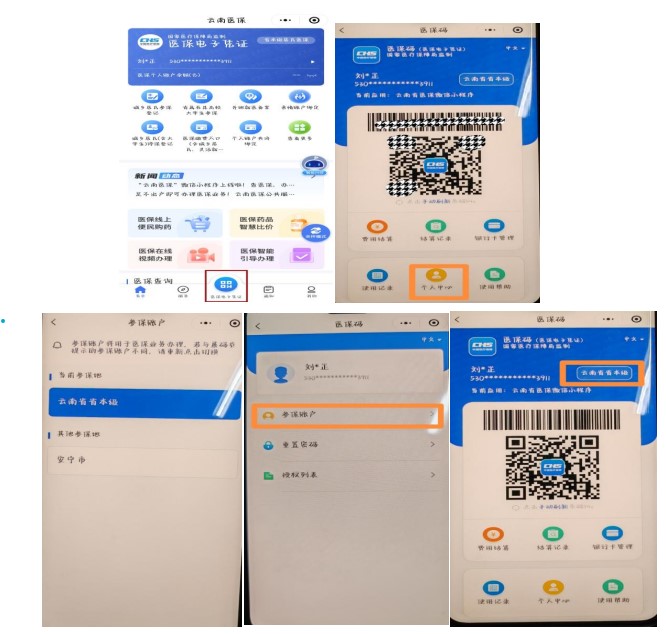 完成参保登记、缴费及开具缴费电子回单成功后,返回“云南医保”首页→点击“医保电子凭证”→点击“个人中心”→点击“参保账户”→点击“当前参保地”选择“云南省省本级”。(学生生病就医缴费时,登录微信“云南医保”小程序,出具“医保电子凭证”(医保码)就可享受大学生医保报销待遇。)